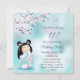 Uma boneca de kokeshi fofa num kimono de turquesa rosa-pia debaixo de uma árvore de cherryblossom rosa. Com um fundo de turquesa. Com um texto personalizado em uma fonte elegante para as festas de aniversário femininas.