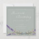 Um belo e elegante convite de aniversário para adultos desenhado com flores de lavanda de aquarela pintadas à mão. Personalizável para qualquer marco de aniversário. Sage green call com script prateado
