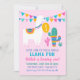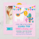Venha se juntar a nós para toda a diversão de lhama com este convite de aniversário colorido para meninas. Um lhama ilustrado festivo adornado com uma faixa de bandeirolas coloridas está entre plantas de cactus do deserto em um fundo rosa brilhante. Letras grossas de "Lhama Divertido" em fucsia e azul anuncia a celebração, com espaço para a foto de seu filho na frente. Todo o texto é totalmente personalizável, incluindo o nome, idade e detalhes da festa.