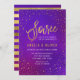Convite de aniversário de casamento elegante com uma borda de estrelas e a palavra "Soirée" em dourado falso sobre um fundo de aquarela roxa. Um convite de aniversário versátil que é perfeito para celebrar qualquer quantidade de anos juntos. O cartão inclui um verso listrado. Confira outros itens correspondentes aqui https://www.zazzle.com/collections/elegant_starry_purple_watercolor_celebrations-119469232199993091?rf=238364477188679314