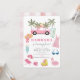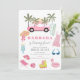 O convite para a foto de aniversário desta garota bonita apresenta uma palmeira, palmeiras cor-de-rosa, um arco-íris, pranchas, um chapéu de palha, uma bebida rosa, óculos de sol, uma cadeira de praia, um guarda-chuva, uma bola de praia, pás-rolhas e tubo flamingo rosa. O verso apresenta um fundo branco com faixas pretas. Personalize-o para as suas necessidades. Perfeito para festas de aniversário, blocos, coquetéis, festas de verão, festas de formatura e festas de limpeza doméstica. Você pode encontrar mais produtos correspondentes na minha loja.