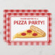 Este modelo de cartão de convite de aniversário de pizza divertido apresenta um desenho legal de uma fatia gordurosa de pizza com três pedaços de salame e muito queijo em cima dele. A cor de fundo é vermelha com um padrão clássico de xadrez gingham.