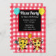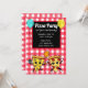 Pizzas lindas desenhadas à mão dançando com balões, convites para festas de xadrez vermelha e branca para festas de pizza para crianças, adolescentes ou adultos!