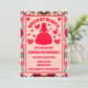 Uma carta retrorativa inspirou a Rainha dos Rosas e Alice no mundo maravilhoso, design de convite de aniversário temático em uma paleta colorida vermelha e rosa brilhante com rosas e detalhes de corações.