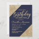 Os cantos de sequenciação dourados, elegantes, quicos e glamourosos falidos impressos e o guião dourado num fundo azul marinho, Convites de festas de aniversários. Este design clássico e sofisticado é perfeito para o indivíduo clássico, na moda e tradicional de Aniversário. Personalize com sua própria mensagem na frente e monograma personalizado no verso. Todos os impressão