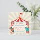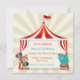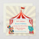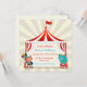 Um convite do squareba do divertimento com um tema do circo caracteriza uma tenda do circus vermelha e branca, um palhaço com balões e um elefante azul.