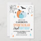 Convite de aniversário de Halloween. Uma festa de aniversário manchada, convidada com abóboras e estrelas e aranhas.