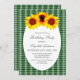 Convite de aniversário de girassol com fundo de xadrez