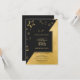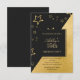 uma combinação de damasco preto e dourado. um elegante quadrado preto no meio com o anúncio do evento. Sobre um fundo negro estão reluzentes estrelas ouros