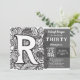 Este design especial apresenta uma arte de linhagem de tatuagem branca e preta com um monograma "R" arrojado rodeado de peônias, rosas, girassóis e outras flores. Se você não é um "R", este fundo está disponível em muitas iniciais de monograma. Comemore um aniversário de marco com este modelo fácil de atualizar. Basta preencher o nome, a idade, a data, a hora, a localização da parte e quaisquer notas RSVP ou outras informações.