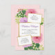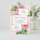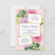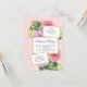 Flores cor de água rosa e lavanda com folhas verdes sobre fundo rosa dourado. Todos os detalhes do partido estão em quadrados brancos com uma armação de ouro
