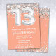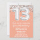 Convite de aniversário de 13 anos de Peach prata e branco Convite de festa de 13 anos para um preto branco prata com escrita moderna e balões de folha divertidos.