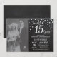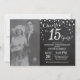 Aniversário de 15 anos de casamento com foto personalizada. Convite de Giz Preto e Prata. Aniversário de Quinze Anos de Casamento. Fundo de Diamante Brilhante Preto e Prata. Confetes Prata. Aniversário de Adulto. Festa de Aniversário de Homem ou Mulher. Para personalização adicional, clique no botão "Personalizar" e use nossa ferramenta de design para modificar este modelo.