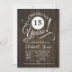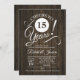 Convite de aniversário de 15 anos rústico com padrão de madeira marrom escuro e fonte script branca. Saúde por 15 anos! Perfeito para uma celebração elegante.