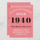 Para aqueles nasceres em 1940 e celebrando a sua festa de aniversário, temos o cartão de convite de aniversário ideal. O fundo cor-de-rosa com um design branco e preto é simples e, no entanto, elegante. Personalize facilmente o texto na frente e na parte traseira deste cartão de convite de aniversário usando o modelo fornecido. Parte da gama de padrões de configuração de cartões, suprimentos para festas e presentes.