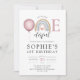 Bonita e engraçada senhorita ONEmagnifico tema aquarela boho rainbow convite de primeiro aniversario com balões. Um balão bonito e um padrão arco-íris na parte de trás do convite, com pinças pastel, blues e ouro e pequenos corações cor-de-rosa. Disponível como um download digital, ou em impressão, ou ambos!