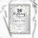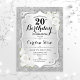 Convite de aniversário de 20. Design elegante em prata e branco. Apresenta fitas cintilantes de prata, fontes de na moda de rosas brancas e confetti. Perfeito para uma festa de aniversário de vidro.