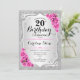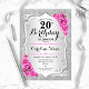 Convite de aniversário de 20. Design elegante em prata e rosa. Possui riscas prateadas com brilho sujo, fonte de script na moda de rosas rosa e confetti. Perfeito para uma festa de aniversário de vidro.