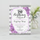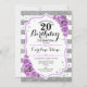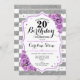Convite de aniversário de 20. Design de lavanda de branca prateada elegante com falso brilho. Listras prateadas e brancas com rosas roxas. Perfeito para uma elegante festa de aniversário de vinte.