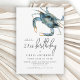 O convite perfeito para comemorar um aniversário de 21 anos especial com tema costeiro, este design apresenta um caranguejo azul no canto superior em aquarelas vibrantes. O texto do convite é moderno com uma elegância casual que é saborosa e hospitaleira. Funciona lindamente para ele ou para ela e a idade pode ser personalizada para qualquer outra idade. Personalize o modelo de texto com seus detalhes específicos. Este convite é uma escolha maravilhosa para celebrações em áreas costeiras, ou jantadas onde os frutos do mar estão sendo servidos.