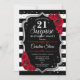 Convite para aniversário de 21 anos surpresa. Design branco, preto feminino, vermelho com prata brilhante. Apresenta faixas pretas e brancas, rosas vermelhas, fontes de script e confetti. Perfeito para uma bolsa mensageifesta de aniversario elegante. Pode ser personalizado para mostrar qualquer idade. Envie-me uma mensagem se precisar de mais personalização.
