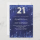 Um convite moderno, na moda e glamouroso para um aniversário de 21 anos. Um fundo azul marinho, decorado com poeira falsa brilhante. A cor azul é irregular. Personalize e adicione seu nome e detalhes da festa. O número 21 é escrito com uma fonte no estilo do balão, script, cor prateada.