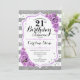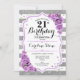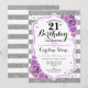 Convite para aniversário de 21 anos. Design púrpura prateada elegante com brilho falso. Listras prateadas e brancas com rosas cor-de-rosa. Perfeito para uma elegante 21ª festa de aniversário.