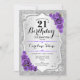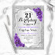 Convite para aniversário de 21 anos. Design floral elegante em prata e roxo. Apresenta faixas de prata com brilho sujo, fontes de script na moda de rosa de de roxo e confetti. Perfeito para uma festa de aniversário de vidro.