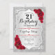 Convite para aniversário de 21 anos. Design floral elegante em prata e vermelho. Apresenta faixas de prata com brilho inverso, fonte de script do rosa vermelha na moda e confetti. Perfeito para uma festa de aniversário de vidro.