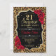 Convite para aniversário de 21 anos surpresa. Preto feminino, design vermelho com ouro brilhante falso. Apresenta padrões de chita de leopardo animal, rosas vermelhas, fonte de script e confetti. Perfeito para uma bolsa mensageifesta de aniversario elegante. Pode ser personalizado para mostrar qualquer idade. Envie-me uma mensagem se precisar de mais personalização.
