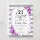 Convite para aniversário de 21 anos surpresa. Branca feminina, design de lavanda com cintilação falsa. Apresenta faixas, rosas púrpura pastel, fonte de script e confetti. Perfeito para uma bolsa mensageifesta de aniversario elegante. Pode ser personalizado para mostrar qualquer idade. Envie-me uma mensagem se precisar de mais personalização.