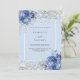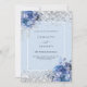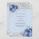 Um fundo azul claro decorado com rosas azuis, flores e confete prateado sujo. Personalize e adicione seus nomes e detalhes do casamento. Letras negras.