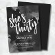 Diversão Girly Watercolor Black Silver e White aniversário de 30 anos Invitation. Você pode mudar para qualquer ano de aniversário! 30, 40, 50 ou mesmo para outros eventos! Vamos comemora que ela tem trinta anos com este convite elegante, mas feminino, preto e branco ou prata e trinta festas de aniversário. Apresentando fundo preto e cor d'água falso prata ou cinza ou tinta alcoólica para dar o pano de fundo a este convite, e tipografia branca de caligrafia misturada com uma fonte mais elegante com os detalhes. Disponível como um convite impresso ou como um convite digital para download que você pode enviar por e-mail ou que foi impresso localmente!