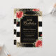 Convite floral elegante, preto e branco, listrado, com aniversário de 30 anos, que inclui um quadro dourado decorado por um confete de ouro, rosas vermelhas e verde.