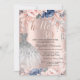 Um vestido moderno, chique e glamouroso, flores azuis com brilho prateado pingando sobre um fundo de ouro rosa.