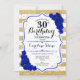 Convite para aniversário de 30 anos. Design elegante em ouro, branco, azul real com brilho falso. Apresenta faixas de ouro e brancas, rosas de safira, fonte de script e confetti. Perfeito para uma elegante festa de aniversário de trinta.