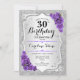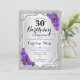 Convite para aniversário de 30 anos. Design floral elegante em prata e roxo. Apresenta faixas de prata com brilho sujo, fontes de script na moda de rosa de de roxo e confetti. Perfeito para uma festa de aniversário de vidro.