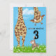 Uma girafa bonita na grama com um macaco e margaridas para convite para aniversário de 3 anos. A idade pode ser alterada. O texto no verso é editável.