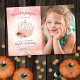 Este convite de festas bonito apresenta uma foto vertical e é acentuado com uma abóbora, flores a aquarela e ouro rosa. Esta design é perfeita para a festa de outono de uma menina. Fotografia © Storytree Studios, Stanford, CA