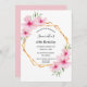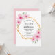 Um convite de festas floral tropical com flores de hibisco cor-de-rosa, verde-verde e uma estrutura geométrica falsa de ouro. Fundo branco elegante. Modelos para um nome escrito com um script de estilo manuscrito moderno, modelos para suas informações de partido. Texto preto. Perfeito para uma festa de verão, piscina ou praia! Traseira: rosa pastel macio.