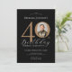 Convite para aniversário de 40 anos de Surpresa Dourada de Foto Preta Elegante. Celebre um aniversário marcante com nosso convite para o Elegante Simples Preto e Dourado, perfeito para adicionar um toque de sofisticação ao seu dia especial. Este design personalizável apresenta um fundo preto elegante adormecido com sotaques dourados elegantes, criando um eterno e um aspecto elegante. Personalize-o ainda mais com uma foto personalizada para tornar seu convite realmente único e memorável. Ideal para quem aprecia uma estética refinada, esse convite dá o tom para uma celebração que será apreciada por anos.
