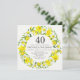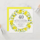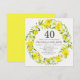 Bonito convites de coroa floral amarela e branca para uma festa de aniversário de 40 anos. Flores daffodil amarelas e brancas com folhagem delicada criam um belo buquê primavera contra um delicado fundo esbranquiçado. Todo o texto de amostra pode ser personalizado para fornecer os detalhes do celebrante de aniversário, o local da festa e as informações de RSVP.