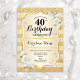 Convite para aniversário de 40 anos. Design floral elegante em ouro e branco. Apresenta fitas de ouro com brilho sujo, fontes de na moda de rosas brancas e confetti. Perfeito para uma festa de aniversário de vidro.