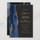 A borda esquerda deste elegante convite de aniversário moderno apresenta uma marinho azul de aquarela agata borda aparada com brilho dourado. O texto personalizável combina o script dourado e as fontes sans serif em um fundo preto de slate. O verso apresenta um design de agate azul e dourado correspondente.