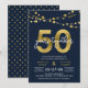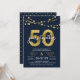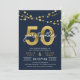 Convite de 50º aniversário elegante com cordões de luzes e "50" em dourado falso com "anos juntos" em branco sobre um fundo azul escuro. O cartão inclui um verso com padrão correspondente. Confira itens correspondentes, como adesivos e selos, aqui https://www.zazzle.com/collections/strings_of_lights_faux_gold_celebration_collection-119311942951401241?rf=238364477188679314
