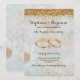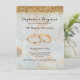 Cartão de convite plano elegante e sofisticado para o 50º aniversário de casamento dourado, com alianças de casamento em um belo fundo celestial com uma chuva de brilho dourado falso caindo do topo. Todos os detalhes da tipografia decorativa são fáceis de personalizar completamente. Um design moderno e sofisticado com um toque de glamour cintilante.