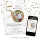Convite de Aniversário de 50 anos de Casamento em Caligrafia de Ouro Branco. Convite de celebração de aniversário de casamento especialmente projetado com elegância, apresentando uma foto personalizada do casal e caligrafia com elementos florais vintage. Uma maneira verdadeiramente memorável e especial de celebrar este marco!