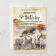 Convide seus amigos e entes queridos e comemore o aniversário de 5 do seu filho com este convite de aniversário safari que mostra uma paisagem de savana africana ao fundo e um grupo de bebês, que inclui um filhote de tigre, elefante, rinocerontes, pintinho de avestruz, zebra e cegonha no primeiro plano.