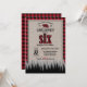 Fundo de xadrez de búfalo vermelho super fofo e moderno com elementos rústicos e country encantadores, como um urso, machados de lenhador cruzados e fontes divertidas e populares para seus convites de festa de aniversário únicos.
