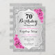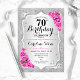 Convite de aniversário de 70. Design floral elegante em prata e rosa. Possui riscas prateadas com brilho sujo, fonte de script na moda de rosas rosa e confetti. Perfeito para uma festa de aniversário de vidro.